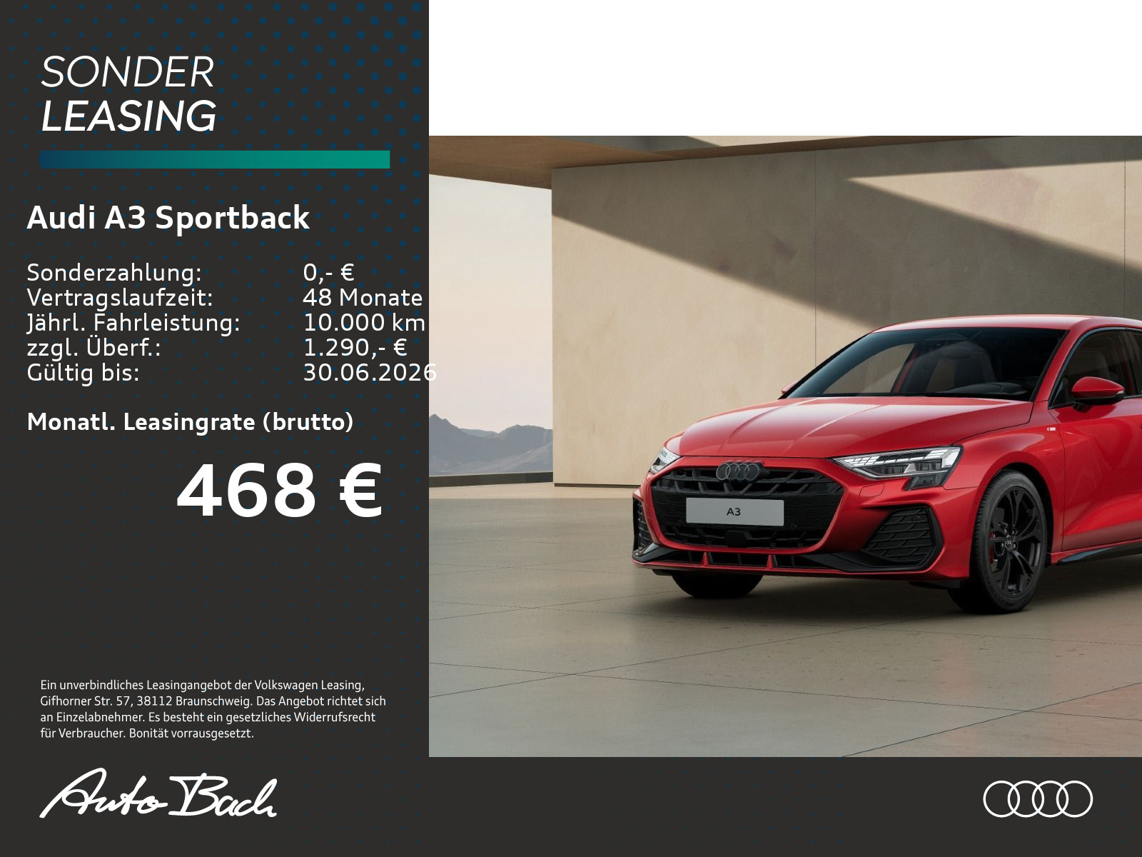 Auftrags-Nr. V_ACHM74 DZ, schwarz-schwarz-expressrot /schwarz-schwarz/schwarz/schwarz, Audi drive select, Sportkontur-Lederlenkrad, 3-Speichen, unten abgeflacht mit Multifunktion plus und Schaltwippen, Fahrersitz elektrisch einstellbar, Komfortöffnung Gepäckraumklappe, Optikpaket schwarz plus, Dekoreinlage Aluminium Spektrum dunkel, Parkassistent plus mit Einparkhilfe mit Umgebungsanzeige, Adaptiver Geschwindigkeitsassistent, Scheinwerfer-Reinigungsanlage, Einstiegs-LED mit S-Logoprojektion vorn, SONOS Premium Soundsystem mit 3D-Klang, Betriebserlaubnis Nachtrag, Mobilfunk-Signalverstärker Typ 1, Soundaktor für Antriebssound innen, Audi connect Navigation & Infotainment plus, Audi Application Store und Smartphone-Interface, Dynamikpaket, Interieur S mit Sportsitzen, Stoff/Kunstleder-Kombination schwarz, LED-Scheinwerfer und LED-Heckleuchten mit dynamischem Blinklicht Heck, Komfortpaket, Klimatisierungspaket plus, Infotainmentpaket Connectivity, Assistenzpaket Fahren und Parken plus, Sonnenschutzverglasung abgedunkelt, Ambiente-Lichtpaket plus, Räder Audi Sport, 5-Y-Doppelspeichen, schwarz metallic, 8,0Jx18, Reifen 225/40 R18, Businesspaket plus, Audi Neuwagen-Reifengarantie, Steuerungsnummer 8, Farbnähte rot Audi Sport GmbH, Progressivrot Metallic, Stabilisator vorn, Radstand, Stabilisator hinten, Einbau Differenzierung für Getriebe"DQ 200" -- Fahrzeugteile --, Mild-Hybrid, Mit spez.Schilder/Aufkleber/ Sicherheitszertifikate für Deutschland, 4-Lenker-Hinterachse, Standardabgasanlage, Fußmatten vorn und hinten, Bordliteratur in Deutsch, Standard-Klimazonen, Standard-Klimazonen, Kraftstoffsystem Otto-Einspritzer, BRS für Fahrzeuge mit E-Antrieb (ESC und eBKV), BRS für Fahrzeuge mit E-Antrieb (ESC und eBKV), Aktivkohlebehälter (EVAP), spezielles Typschild EU, Reifenreparaturset, Gurtanlegekontrolle mit Sitzbelegungserkennung hinten, Sportfahrwerk, Progressivlenkung, Radschrauben Standard, Bordwerkzeug, Bordwerkzeug, Verbandmaterial mit Warndreieck, Frontantrieb, Serienkraftstoff-Erstbefüllung, Scheibenbremsen vorn, 16 Zoll, Bremssättel rot lackiert, Scheibenbremsen vorn, 16 Zoll, Bremssättel rot lackiert, Fahrzeugklassen-Differenzierung-8Y0/8YF-, Scheibenbremsen hinten, 15 Zoll, Bremssättel rot lackiert, Scheibenbremsen hinten, 15 Zoll, Bremssättel rot lackiert, Stoßfänger S line, Aufkleber/Schilder, englisch-deutsch, Aufkleber/Schilder, englisch-deutsch, Modellkennzeichnung am Heck, Kennzeichenträger hinten (ECE), Kindersitzbefestigung i-Size-konform auf Beifahrerseite und äußeren Fondsitzen, Top Tether für äußere Fondsitze, Kindersitzbefestigung i-Size-konform auf Beifahrerseite und äußeren Fondsitzen, Top Tether für äußere Fondsitze, Kindersitzbefestigung i-Size-konform auf Beifahrerseite und äußeren Fondsitzen, Top Tether für äußere Fondsitze, Rücksitzlehne umklappbar, Dachreling, Entfall, Kopfstützen hinten (3 Stück), Sitzheizung vorn, Ausweichassistent und Abbiegeassistent, Wärmeschutzverglasung Frontscheibe, Kindersicherung elektrisch, Kindersicherung elektrisch, Innenspiegel abblendbar, Modul Boden hinten Ausführung 5, Airbags vorn, Beifahrerairbag deaktivierbar, Abgaskonzept, WLTP3 M1, N1-I//EU6EB, Abgaskonzept, WLTP3 M1, N1-I//EU6EB, UWB fähiges Land und Trägerfrequenz 433,92 bis 434,42Mhz, S-Dachkantenspoiler, Außenspiegel Fahrerseite asphärisch, Beifahrerseite konvex, Folienbeklebung, Folienbeklebung, Kopfstützen vorn, Kopfstützen vorn, Seitenairbags vorn mit Kopfairbagsystem und Interaktionsairbag vorn, Mittelarmlehne vorn, Lenkradapplikation Chromoptik, S-Emblem, Lenkradgriffe perforiertes Leder und Kontrastnaht, Außenspiegelgehäuse in Wagenfarbe, "Basis", Spurverlassenswarnung mit Notfallassistent, Dachhimmel Stoff schwarz, Außenspiegel elektrisch einstell- und beheizbar, Geschwindigkeitsbegrenzungsanlage, Geschwindigkeitsbegrenzungsanlage, Geschwindigkeitsbegrenzungsanlage, Wegfahrsperre elektronisch, USB-Anschlüsse mit Ladefunktion im Fond, USB-Anschlüsse mit Ladefunktion im Fond, Schalt-/Wählhebelknauf, Armauflage Kunstleder, Reifendruck-Kontrollanzeige, Start-Stop-System, 4-Wege-Lendenwirbelstütze für die Vordersitze, MMI Navigation plus mit MMI touch, MMI Navigation plus mit MMI touch, MMI Navigation plus mit MMI touch, MMI Navigation plus mit MMI touchDie angegebenen Verbrauchsangaben beziehen sich auf WLTP-Werte. Zwischenverkauf und Irrtümer für dieses Angebot sind ausdrücklich vorbehalten. Ausschlaggebend sind einzig und allein die Vereinbarungen in der Auftragsbestätigung oder im Kaufvertrag. Den genauen Ausstattungsumfang, die genauen Kilometer und den Verkaufspreis erhalten Sie von unserem Verkaufspersonal. Bitte kontaktieren Sie uns.