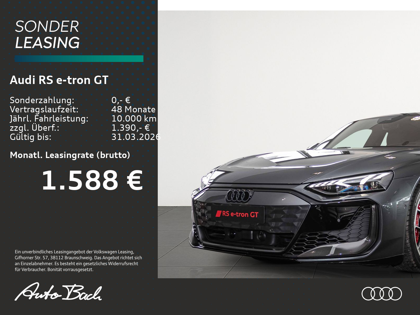 Auftrags-Nr. ABHC60 DZ, schwarz-schwarz-expressrot /schwarz-schwarz/schwarz/schwarz, Aktivfahrwerk, Luftqualität-Paket, Sitzheizung vorn und hinten, Sitzbelüftung und Massagefunktion vorn, Frontscheibe in Klimakomfort- und Akustikverglasung, Optikpaket Carbon glänzend, Dekoreinlagen Carbon Köper seidenmatt, Räder, 6-Doppelspeichen-RS, schwarz metallic, glanzgedreht und glanzgefräst, 9,5J|11,5Jx21, Reifen 265/35|305/30 R21, Lenkradkranz Mikrofaser Dinamica schwarz, Außenspiegelgehäuse Carbon, Adaptiver Fahrassistent mit Notfallassistent, Dachhimmel Mikrofaser Dinamica schwarz, Betriebserlaubnis Nachtrag, Head-up-Display, Leder-Kombination perforiert mit Wabensteppung, Stahlbremsanlage mit Wolframcarbid-Beschichtung und Bremssätteln rot, Assistenzpaket plus mit Remote Parkassistent plus, RS-Designpaket rot, Allradlenkung mit Sportlenkung vorn, Matrix LED-Scheinwerfer mit Audi Laserlicht und LED-Heckleuchten, Lichtinszenierung und dynam. Blinklicht, Sportsitze pro vorn, Sonnenschutzverglasung abgedunkelt, Garagentoröffner, Einstiegsleisten Carbon seidenmatt, beleuchtet, Akustikverglasung Tür- und Seitenscheiben, Audi Neuwagen-Reifengarantie, Steuerungsnummer 8, Persönliche Beratung zur Audi AutoVersicherung durch Ihren Audi Partner, Persönliche Beratung zu Audi Wartungspaketen durch Ihren Audi Partner, Daytonagrau Perleffekt, o.b.Abgas, Gewichtsklasse Vorderachse Gewichtsbereich 4, Antriebssystem BEV, Mit spez.Schilder/Aufkleber/ Sicherheitszertifikate für Deutschland, Allradlenkung, Fußmatten vorn und hinten, Bordliteratur in Deutsch, Bordliteratur in Deutsch, spezielles Typschild EU, Reifenreparaturset, Sportlenkung, Radschrauben diebstahlhemmend, Verbandmaterial mit Warndreieck und Warnwesten, quattro, Scheibenbremsen vorn (Geomet D), Lenkradeinstellung elektrisch, Fahrzeugklassen-Differenzierung -4J1-, Scheibenbremsen hinten, Tankdeckel, Tankdeckel, Modellbezeichnung gemäß neuer Leistungskennzeichnung, Sportkonturlenkrad, 3-Speichen, oben und unten abgeflacht mit Multifunktion, Schaltwippen und Bediensatelliten, Kindersitzbefestigung i-Size-konform, Top Tether für die Rücksitzbank, Panorama-Glasdach, Vordersitze elektrisch einstellbar mit Memory-Funktion für den Fahrersitz, Komfortschlüssel mit sensorgesteuerter Gepäckraumentriegelung, mit Safelock, Innenspiegel automatisch abblendend, rahmenlos, Dreip.-Automatikgurte vorn,mit manueller Höheneinstellung, Airbags vorn, Beifahrerairbag deaktivierbar, Seitenairbags vorn und hinten und Kopfairbagsystem, Zierleisten in Schwarz, Trägerfrequenz 433,92 bis 434,42 MHz, Folienbeklebung, 3 Hintersitze, Außenspiegel rechts (großes Sichtfeld), konvex, Außenspiegel links, asphärisch, Sonnenblenden vorn, Sonnenblenden vorn, Singleframe in Wagenfarbe, Audi pre sense basic, Audi pre sense front, Kennzeichenträger hinten (ECE), Kennzeichenträger vorn (groß), Außenspiegel elektrisch einstell-, beheiz- und anklappbar, automatisch abblendend mit Memory-Funktion, Haushaltsstecker Typ E/F für das e-tron Ladesystem, Industriestecker CEE 16A, 400V, lang und gerade, für das e-tron Ladesystem, Ladekabel Mode 3 für öffentliches Laden bis zu 22 kW (AC), Diebstahlwarnanlage, Diebstahlwarnanlage, Interieurelemente oben und unten, Leder Feinnappa/Mikrofaser Dinamica, Audi virtual cockpit plus mit zusätzlichem RS-Layout, Reifendruck-Kontrollsystem, MMI Navigation plus mit MMI touch, Parkassistent mit Einparkhilfe plus, Spurwechselwarnung mit Ausstiegswarnung und Querverkehrassistent hinten, Reifen rollwiderstandsoptimiert, 265/35 R21 vorn, 305/30 R21 hinten, Matrix LED-Scheinwerfer mit dynamischem Blinklicht, Matrix LED-Scheinwerfer mit Audi Laserlicht, dynam. Lichtinszenierung und dynamischem Blinklicht, Tagesfahrlichtschaltung, Adaptiver Geschwindigkeitsassistent mit Geschwindigkeitsbegrenzer, Effizienz-, Ausweich- und Abbiegeassistent, LED-Heckleuchten mit dynamischer Lichtinszenierung und dynamischem Blinklicht, Doppelton-Signalhorn, Doppelton-Signalhorn, Nichtraucherausführung, Nichtraucherausführung, Gurtanlegekontrolle, Gurtanlegekontrolle, Bang & Olufsen Premium Soundsystem mit 3D-Klang, Bang & Olufsen Premium Soundsystem mit 3D-Klang, Audi phone box, Audi phone box, Audi AG, Top-Sport-Ausstattung, Serienqualität, Rechtsverkehr, Typprüfland Deutschland, Typprüfland Deutschland, Typprüfland Deutschland, Typprüfland Deutschland, FahrzeugladekabelDie angegebenen Verbrauchsangaben beziehen sich auf WLTP-Werte. Zwischenverkauf und Irrtümer für dieses Angebot sind ausdrücklich vorbehalten. Ausschlaggebend sind einzig und allein die Vereinbarungen in der Auftragsbestätigung oder im Kaufvertrag. Den genauen Ausstattungsumfang, die genauen Kilometer und den Verkaufspreis erhalten Sie von unserem Verkaufspersonal. Bitte kontaktieren Sie uns.